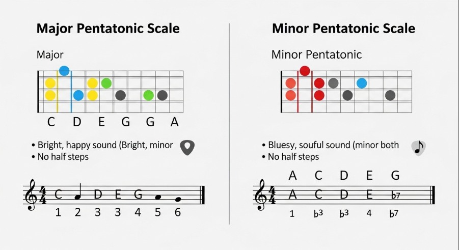 Here’s the thing: the pentatonic scale isn’t just one formula. There’s a major and a minor version – and they’re more connected than you think. Once you understand how major and minor pentatonic scales work together, you’ll unlock a completely new palette of sounds without learning hundreds of new patterns.